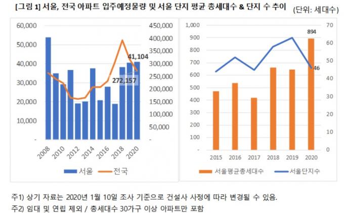 입주 단지는 46개로 전년(63개 단지)대비 적지만, 단지 평균 규모는 894가구로 최근 5년 평균치(546가구)를 크게 넘어선다. 특히 강동, 양천, 은평 등 2000가구 이상의 메머드급 단지가 입주를 앞두며 물량이 증가했다.