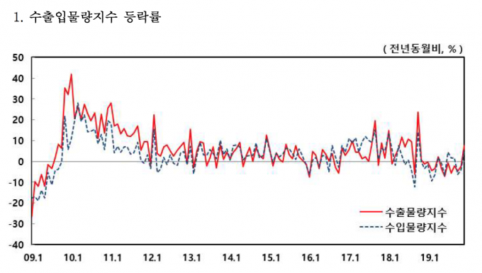 2018년 12월 이후 세계교역이 둔화하고 국제유가가 하락한 게 기저효과로 반영됐으며 미중 무역분쟁이 완화한 것도 수출물량 반등에 영향을 미쳤다고 한은은 진단했다.