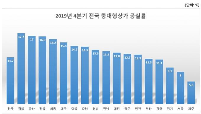 공실률이 가장 높은 지역은 평균 17.7%를 기록한 경북이다. 이어 울산(17%), 전북(16.9%), 세종(16.2%), 대구(15.4) 등 지역도 높은 수준의 공실률을 기록했다.