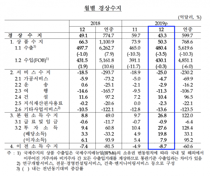지난해 12월 경상수지는 43억3000만 달러 흑자를 기록하면서 8개월 연속 흑자 기조를 유지했다.