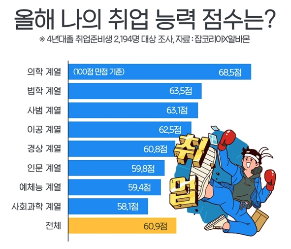 반면 사회과학계열(58.1점), 예체능계열(59.4점), 인문계열(59.8점) 전공 취준생들의 경우는 타 전공 계열보다 스스로 평가하는 취업 능력 점수가 다소 낮았다.