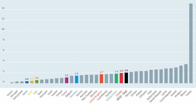 한국은 2017년 근원물가 상승률이 1.7%로 OECD 회원국 가운데 13위였다가, 2018년에는 1.2%로 낮아지면서 순위도 19위로 떨어졌다. 지난해에는 0.7%를 기록하며 29위가 됐다.