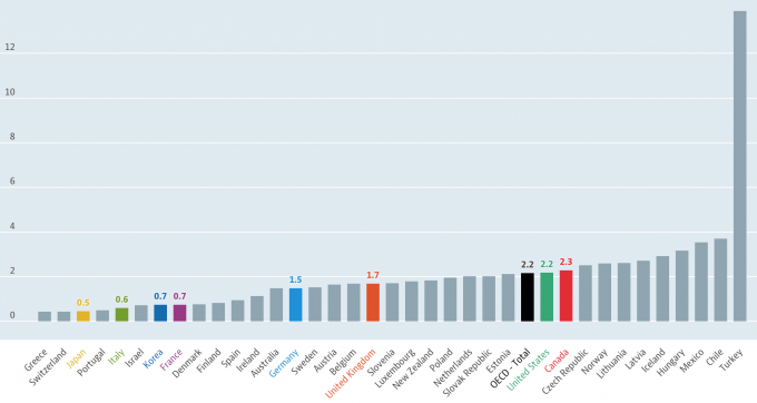 지난해 물가 상승률이 한국보다 낮은 곳은 그리스(0.2%)와 포르투갈(0.3%) 두 국가뿐이었다. 스위스는 0.4%로 한국과 같은 수준을 보였다.