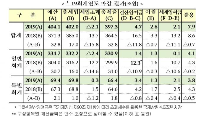 국세수입을 포함한 총세입은 402조 원으로 전년보다 17조 원 늘었지만, 예산(404조1000억 원)보다는 2조1000억 원 부족했다.