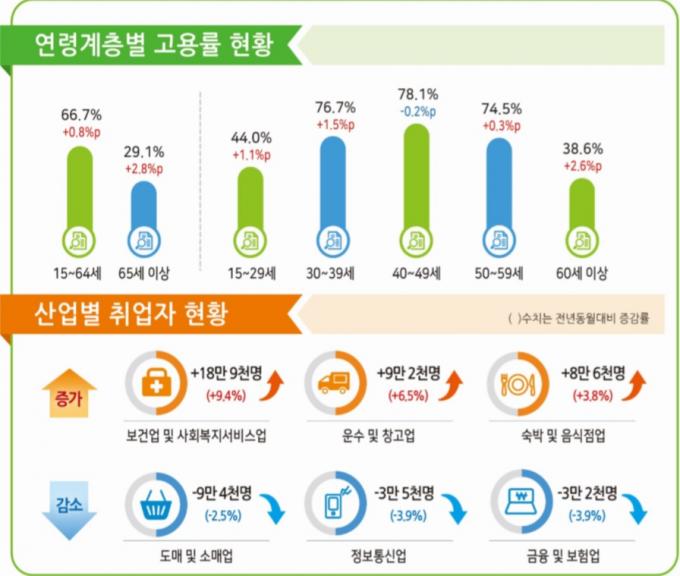 연령별로는 60세 이상 취업자가 50만7000명 늘었다. 관련 통계 작성이 시작된 1982년 7월 이후 가장 많이 증가했다. 특히 65세 이상 취업자가 32만7000명 증가했는데, 역시 1989년 통계 작성 이후 최대였다. 20대는 6만3000명, 50대는 6만2000명 증가했다.