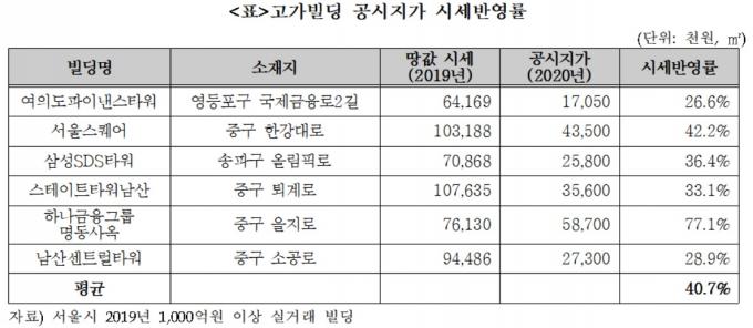 이어 "자체 조사 결과 올해 서울지역 공시지가 현실화율은 고가 빌딩이 40.7%, 아파트가 33% 수준"이라며 "토지 가액 대부분이 아파트나 상업지인 것을 고려할 때, 정부가 발표한 공시지가 현실화율은 이해하기 어려운 수준"이라고 지적했다.