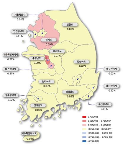 광역시도 별로는 세종시가 0.71% 급등했고 대전도 0.31% 오른 반면 경북과 제주는 하락세를 나타냈다.