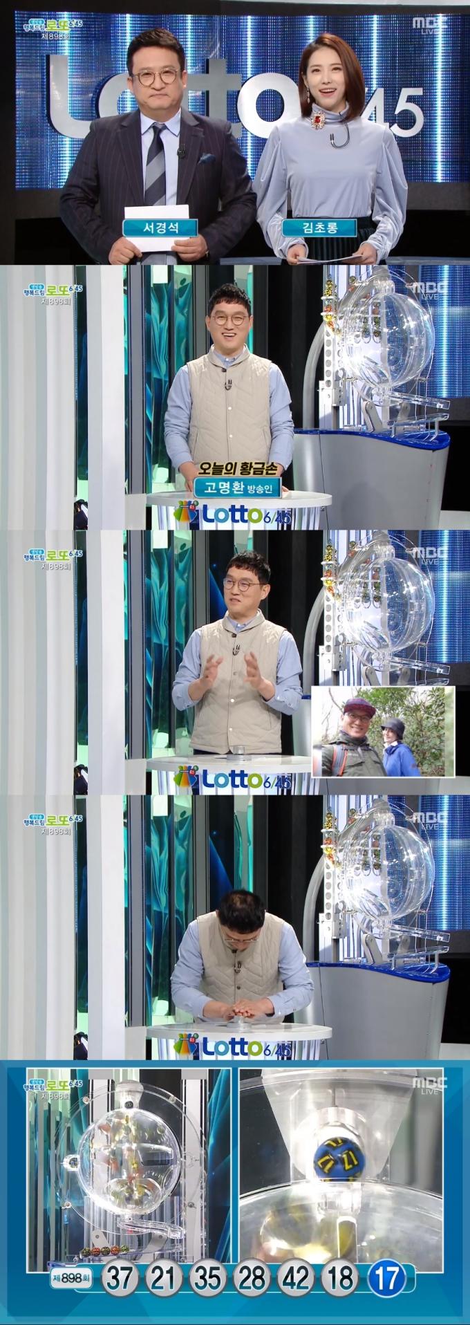 15일 방송된 MBC '생방송 행복드림 로또 6/45'에서는 제898회 로또복권 당첨번호 추첨이 진행됐다. 이날 방송에는 코미디언 고명환이 황금손으로 출연해 복권 추첨 버튼을 눌렀다.