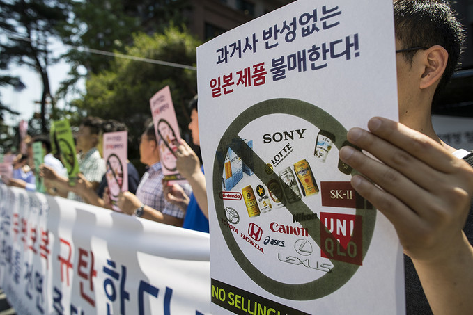 ▲ 한국중소상인자영업자총연합회 관계자들이 지난해 7월 5일 서울 종로구 옛 주한 일본대사관 앞에서 열린 일본 제품 불매운동 선언 기자회견에서 피켓을 들고 있다. [정병혁 기자]