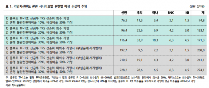 하나금투가 무역금융펀드를 포함한 라임 환매 연기 펀드 잔액 총 1조7000억여 원에 대해 은행 배상 비율 50%, 불완전 판매 비율 30%, 신한금융투자의 총수익스와프(TRS) 선순위 미회수를 가정해 추산한 은행 전체 손실액은 2741억 원이다.