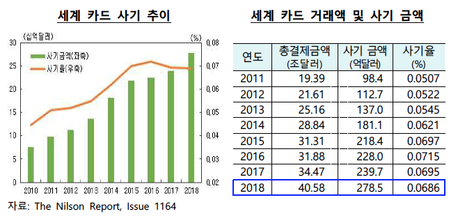 한국은행이 18일 발표한 '주요국의 지급수단 사기동향 및 시사점' 보고서에 따르면 2018년 중 전 세계 카드 사기 금액은 278억5000만 달러(약 33조 원)로 같은 기간 전체 카드 거래액(40조5800억 달러)의 0.069%를 차지하는 것으로 나타났다.