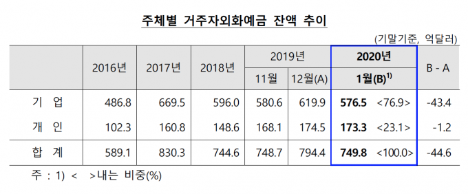 한국은행이 19일 발표한 '2020년 1월 중 거주자 외화예금 동향'에 따르면 지난달 말 기준 거주자 외화예금 잔액은 749억8000만 달러로 전월 대비 44억6000만 달러 감소했다.