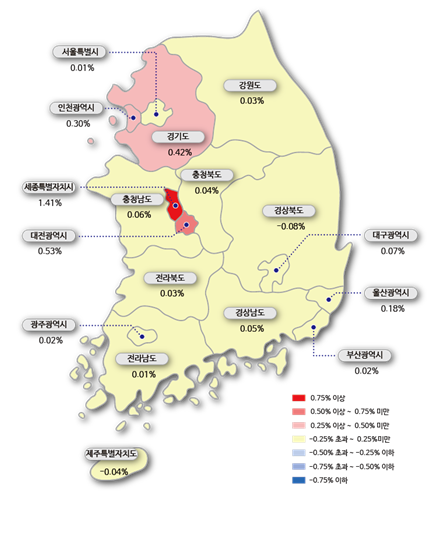 지방에서는 세종시가 1.41% 급등해 전주(0.71%)보다 상승폭이 2배 가까이 커졌다.에서 금주 1.41%로 급등했다. 세종시는 최근 신규 입주 물량이 감소한 가운데 매수 수요가 늘어 상대적으로 가격 수준이 낮은 고운·아름·종촌동 등지의 상승폭이 확대됐다고 감정원은 설명했다.