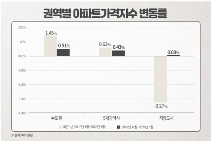 24일 부동산시장 분석업체 부동산인포가 KB리브온 아파트가격지수를 분석한 결과 수도권과 비수도권과의 간격이 좁혀지지 않는 것으로 나타났다. 2019년 1월부터 2020년 1월까지 수도권 아파트가격지수 변동률은 1.45%였지만, 5개광역시는 0.63%, 지방은 -3.27%를 기록했다.