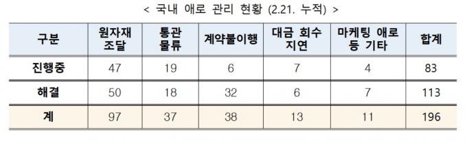 국내 기업에서 들어온 애로사항 196건 중 가장 많은 97건이 원자재 조달이었다. 계약불이행 38건, 통관·물류 37건, 대금 회수 지연 13건, 마케팅 애로 등 기타 11건이 뒤를 이었다.