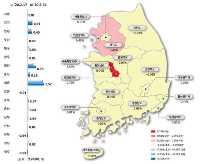 반면 세종은 1.52% 오르면서 전주에 이어 상승폭이 확대됐다. 전국 17개 시도 중 세종의 집값 상승률이 가장 높았다.