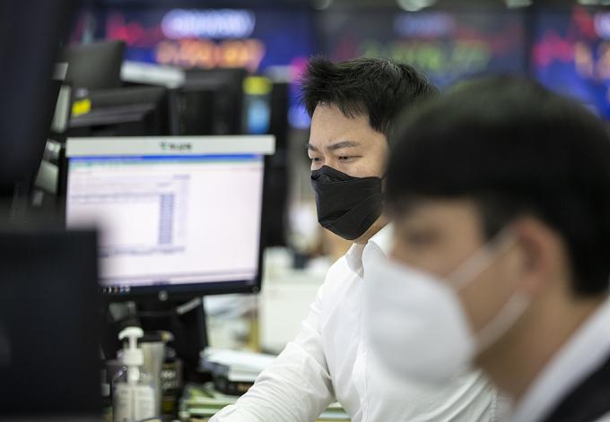 ▲ 지난 26일 서울 중구 KEB하나은행 딜링룸에서 직원들이 마스크를 쓴 채 업무를 보고 있다. [정병혁 기자]