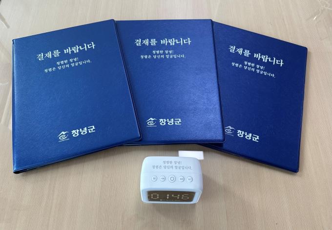 ▲ 청렴결재판 및 청렴 탁상시계 [창녕군 제공]