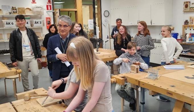▲ 박종훈 교육감이 스웨덴 우수 모델학교의 목공수업을 참관하고 있다. [경남교육청 제공]